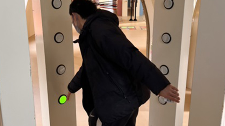 Light buttons all over the wall. Quickly find where the light is and touch it while moving left and right.