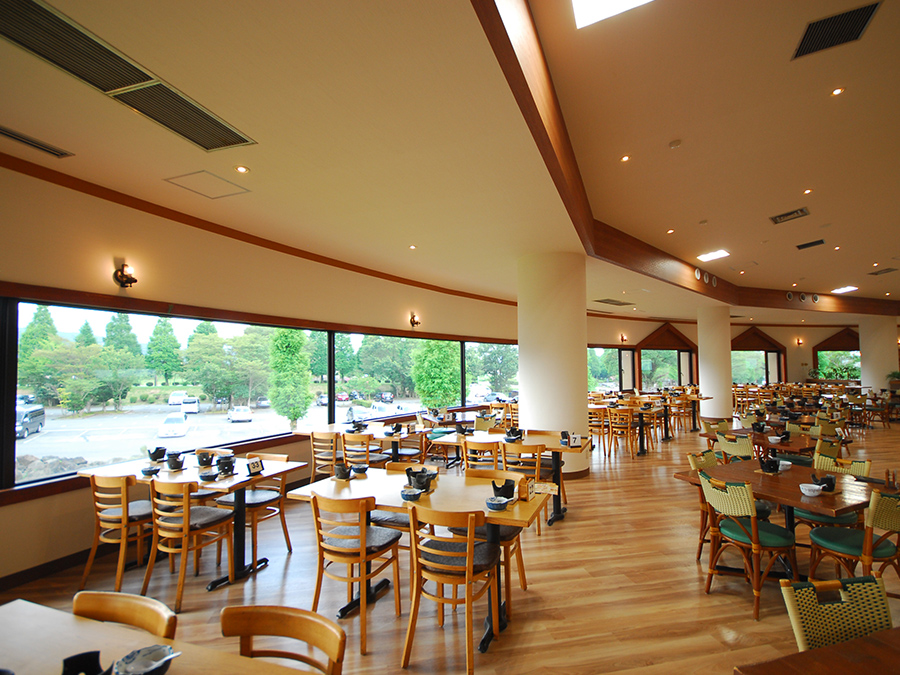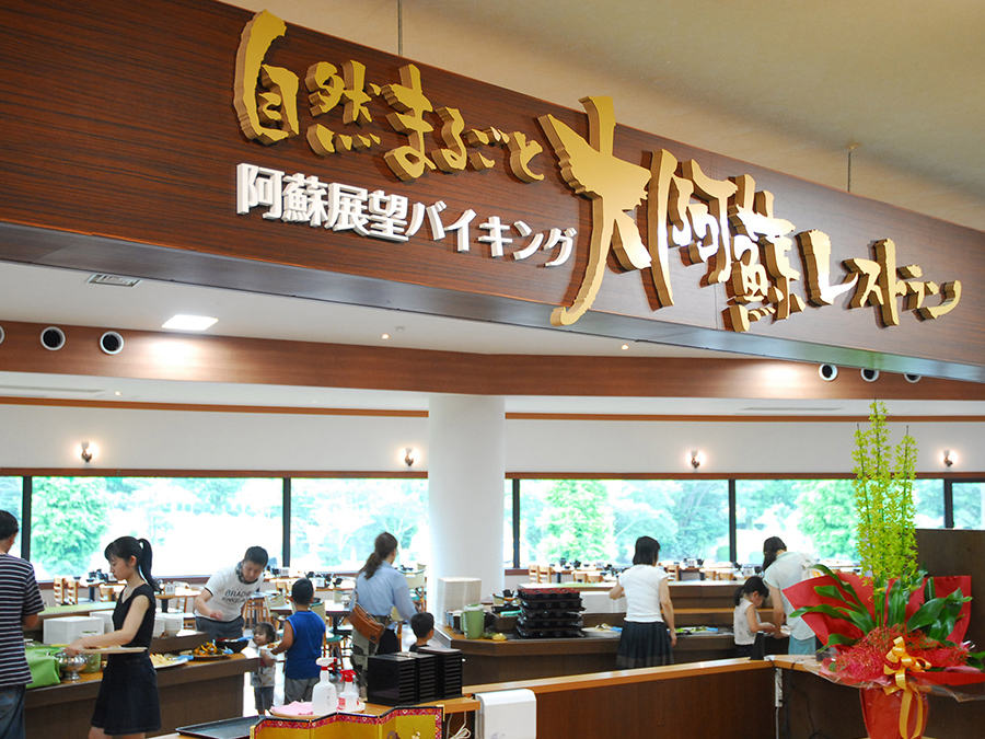 You can enjoy your meal slowly in the large restaurant that can accommodate over 300 people at a time. The large glass windows offer a beautiful view of Aso. Surrounding yourself with food will soothe your soul.