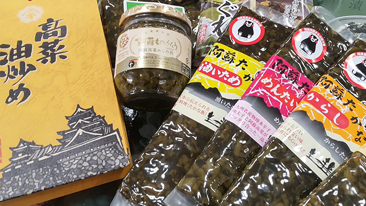 We have a wide selection of products that make perfect souvenirs, such as Kumamoto/Aso's specialties ''horse sashimi'' ,''red beef'' and ''karashi lotus root'' as well as 100% fruit juices, jams, and seasonings, as well as Kumamon goods.